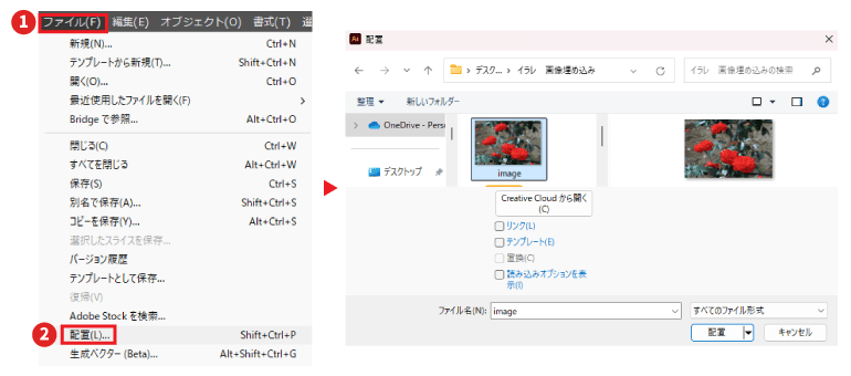 まずは、画面上部の「ファイル」メニュー→「配置」の順にクリックしましょう。次に、配置ダイアログから画像を選びます。ここまで先に紹介した手順と同じです。