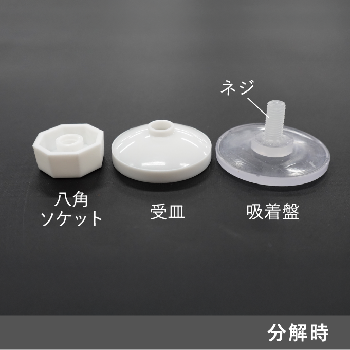 | 素材 | 吸着盤:SBC(スチレン・ブロック・コポリマー) 受皿:PP(ポリプロピレン) 八角ソケット:PP(ポリプロピレン) ネジ:PP(ポリプロピレン) |