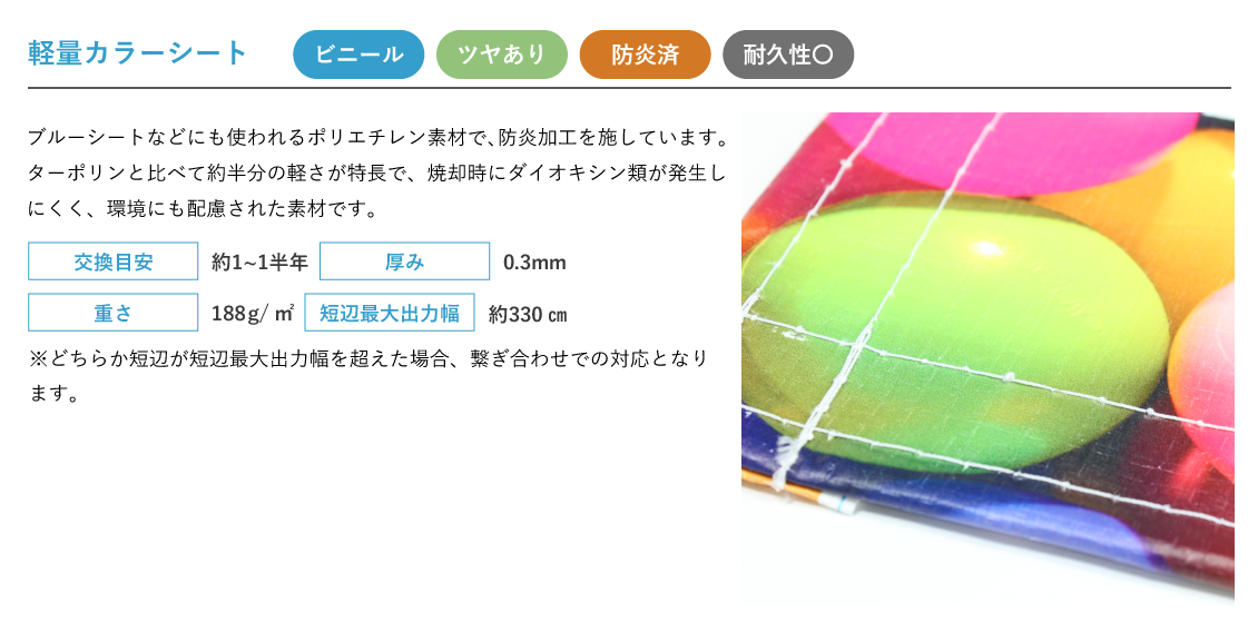 ターポリン生地は、まくつくで取り扱うビニール生地の中で最も耐久性の高い生地です! ビニール素材のため雨風にも強く、耐水性に優れています。写真なども綺麗に印刷でき、防炎加工済みです! 3~5年が交換目安になります。